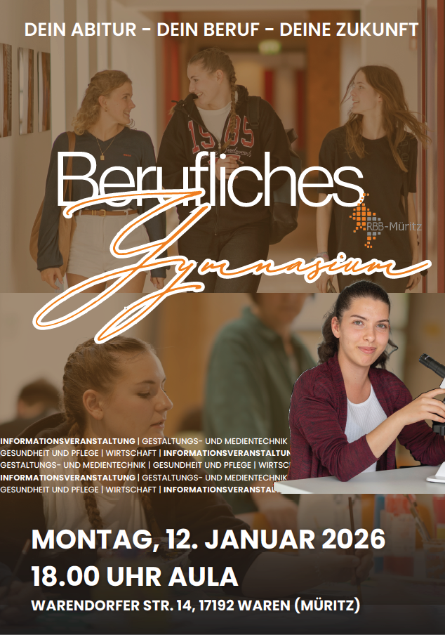 Unser Regionales Berufliches Bildungszentrum Müritz liegt im Herzen Mecklenburg-Vorpommerns. Durch das breit gefächerte Bildungsangebot sind wir ein Kompetenzzentrum für Berufliche Bildung in unserer Region und darüber hinaus.